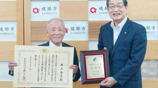 記事 2025.09.26pickup01 92歳の井上秀夫さん=井倉町=内閣府の「エイジレス章」受章元気の秘訣は養蜂、畑、カラオケ研究成果などを次世代へ継承も山崎市長(右)から楯などを受け取った井上さん=市役所で※詳細は紙面で。 2025.09.26 記事