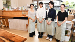 記事 2025.10.03pickup02 カフェ「米茶処 まなゆゐ」あやべ特産館内に開店綾部の米と茶のおいしさ発信健康志向のスイーツなど提供八津合町の「iicome」が出店店内に立つ宮園代表(左端)とスタッフ=青野町で※詳細は紙面で。 2025.10.03 記事