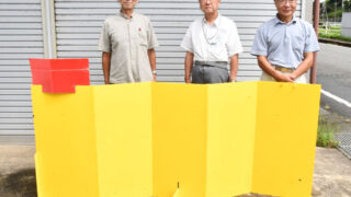 記事 2025.10.06pickup02 楽楽つくろかい草刈り中の小石飛散対策折り畳み式の防止柵考案持ち運び容易、省人化も「草刈り飛散防止柵」を考案した「楽楽つくろかい」の(左から)由良さん、岡野代表、塩尻さん=七百石町で※詳細は紙面で。 2025.10.06 記事