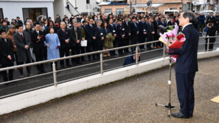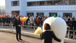 「現役人生を市に捧げる」四方市長が初登庁で決意市職員や市マスコットキャラクター「まゆピー」から花束を受け取る四方市長(市役所玄関前で)※詳細は紙面で。