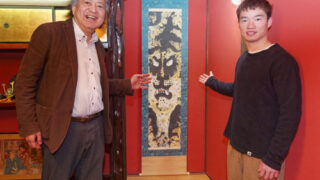 飲食店など18カ所に「有道佐一作品」「偶然の出合い」楽しんで「自適館」の蒲田正樹さん企画3月29日まで各所で展示「紅梅 白梅」など初展示も迫力ある虎の作品を示す蒲田さん(左)と「虎」料理担当の高橋洋希さん=広小路1丁目で※詳細は紙面で。