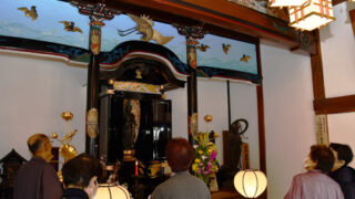 里町の佛南寺 観音堂内部の修復お披露目よみがえった姿 間近に檀家の四方さん2代で寄進修復された厨子や欄間を目にする檀家の人ら(里町で)※詳細は紙面で。