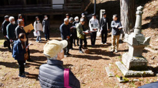 藤懸氏ゆかりの文化財を解説「光明寺歴史懇話会」開く府立大の文化財調査が終了8年間の活動を締めくくる梵鐘の寄進は領主が君臨していることの象徴宝篋印塔(右端)の解説を聴く参加者たち。奥の建物は本堂=睦寄町で※詳細は紙面で。
