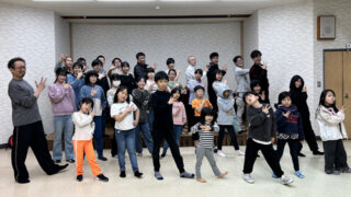 オリジナル創作ダンスで吉美地区を盛り上げよう新プロジェクト「キミダン!!」始動青壮年有志「はちの会」中心に27日の練習会で、「K」の指文字とともに決めのポーズ。左端が山本さん(写真はいずれも多田町で)※詳細は紙面で。