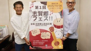 記事 2025.10.17pickup02 26日は「志賀郷フェス」へ子どもや若者の出演大募集本社後援昨年の〝プレ〟経て本格開催楽器体験や屋台も特大サイズのポスターを手にイベントをPRする同フェス実行委員会の村岡代表(右)と井上吉夫さん=大島町のあやべ市民新聞社で※詳細は紙面で。 2025.10.17 記事