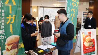 #やべぇあやべバーガー 新発売地元食材の新名物で勝負あやべ温泉運営の「緑土」誘客と経営改善の起爆剤に販売初日は綾部中1年生も店頭に立って売り出しに協力した(写真はいずれも睦寄町で)※詳細は紙面で。