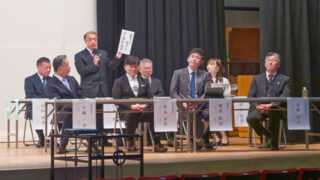 市教育委員会「自治体教創コンソーシアム」に参画小規模特認校制度など共同研究府北部の首長、教育長らと共に登壇し「心を動かす教育」を語る小林教育長=福知山市で※詳細は紙面で。