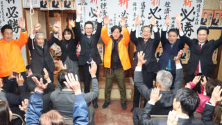 府議補選は無投票に前市議の種清喜之氏が当選へ万歳三唱で無投票当選を祝う種清氏(左から4人目)や来賓、支援者ら=相生町で※詳細は紙面で。