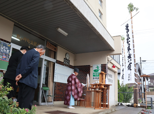 2025.10.08pickup02 記事 X Facebook LINE コピー 2025.10.08 「尊社出輿所」ののぼり旗鳥ケ坪町自治会が35年ぶり新調木祖殿神社の秋季大祭向け全国でもまれ? 小雨が降る中、清めはらい式は新調されたのぼり旗の方を向いて鳥ケ坪町公民館の玄関前の軒下で行われた(上延町で) ※詳細は紙面で。