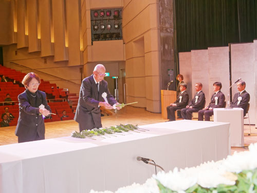 2025.10.17pickup01 記事 X Facebook LINE コピー 2025.10.17 戦争の記憶語り継いで大島悟さん(栗町)が追悼の辞市戦没者追悼式遺族ら281人が参列戦没者2432人に黙とう市遺族会が追悼の歌 献花する大島さん(左から2人目)=里町で ※詳細は紙面で。
