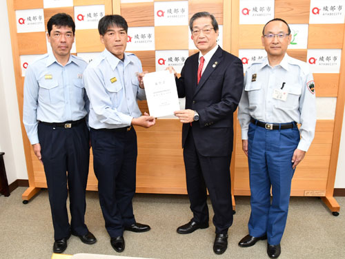 2025.10.31pickup01 記事 X Facebook LINE コピー 2025.10.31 定数を200人減の760人に市消防団活性化検討委が提案山崎市長に検討結果報告条例改正案を12月議会に上程 白波瀬団長(左から2人目)から要望書を受け取る山崎市長=市長応接室で ※詳細は紙面で。
