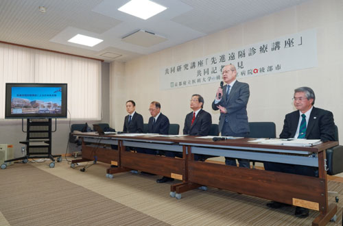 2025.11.19pickup01 記事 X Facebook LINE コピー 2025.11.19 きめ細かな健康寿命対策へ市立病院と府立医大が共同研究月単位の評価と循環器病遠隔診療のシステム構築 共同研究への期待を語る志賀院長(右から2人目)=市役所まちづくりセンターで ※詳細は紙面で。
