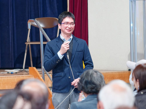 2025.12.01pickup01 記事 X Facebook LINE コピー 2025.12.01 謎と疑問に全身でチャレンジを綾部出身の天文学者・福井暁彦さん市天文館パオ30周年記念講演高精度観測技術を開拓「生命宿る条件」究める 聞き入る子どもたちに「大人になる頃には系外惑星を直接観測できる技術も具体化しているだろう」と伝えた福井さん(里町で) ※詳細は紙面で。