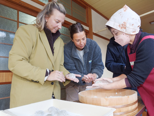 2025.12.08pickup01 記事 X Facebook LINE コピー 2025.12.08 オランダ旅行会社エージェント来綾綾部で体験旅行を農家民宿などでリサーチ海外客向けに企画へ和紙と楮餅は最高のコラボ本物の価値が綾部の魅力 川北さん(右)の手ほどきを受け、楮餅に片栗粉を付けて丸めていくジュリアさん(左)=八津合町で ※詳細は紙面で。