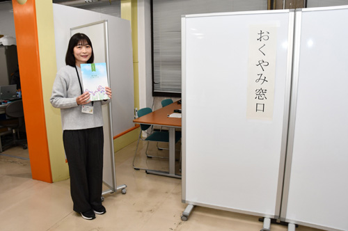 2025.12.15pickup01 記事 X Facebook LINE コピー 2025.12.15 「おくやみ窓口」22日から運用市が本庁舎1階の市民・国保課内で手続き1カ所で遺族の負担軽減新たに「ハンドブック」配布1日に2枠を受け付け ハンドブックを手に「おくやみ窓口」のそばに立つ担当職員(市役所で) ※詳細は紙面で。