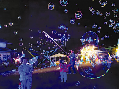 2025.12.17pickup01 記事 X Facebook LINE コピー 2025.12.17 夜空に輝くシャボン玉イベント「ナイトバブル」初開催あやべ特産館が「夢ライト」の中で 夜風に舞う無数のシャボン玉の中に「夢ライト」のイルミネーションの姿が万華鏡のように映し出された(青野町で) ※詳細は紙面で。