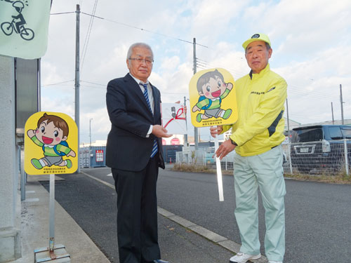 2025.12.19pickup02 記事 X Facebook LINE コピー 2025.12.19 綾部交通安全協会中筋地区自治会連合会に「飛び出し坊や」20基を寄贈「安全・安心のため活用を」累計100基近くの看板整う 滝下会長(右)から看板と目録を受け取った中堂会長=大島町で ※詳細は紙面で。