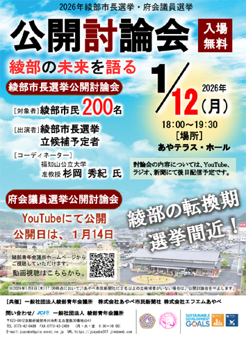 2025.12.22pickup01 記事 X Facebook LINE コピー 2025.12.22 2026.1.25市長選府議補選1月12日にあやテラス・ホールで市長選、府議補選向け公開討論会綾部JC、エフエムあやべ、あやべ市民新聞社パネリストとアンケート募集一般傍聴は当日先着200席 市長選、府議補選の公開討論会を告知するチラシ ※詳細は紙面で。