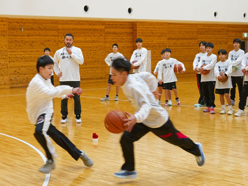 2026.01.07pickup02 記事 X Facebook LINE コピー 2026.01.07 長崎から元プロ選手招き中学生27人が指導受ける市バスケ協会の特別講座 中川さん(左奥)に見守られて練習する中学生たち=西町3丁目で ※詳細は紙面で。