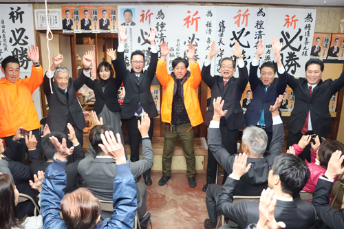 2026.01.19pickup01 記事 X Facebook LINE コピー 2026.01.19 府議補選は無投票に前市議の種清喜之氏が当選へ 万歳三唱で無投票当選を祝う種清氏(左から4人目)や来賓、支援者ら=相生町で ※詳細は紙面で。