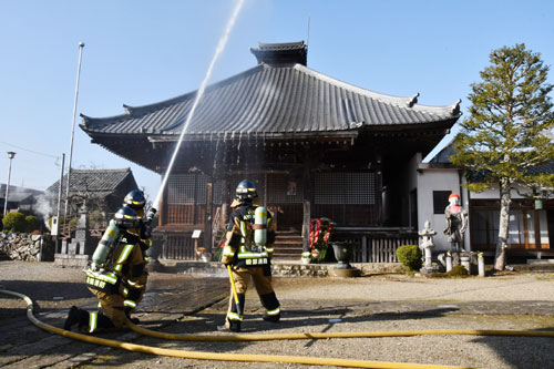 2026.01.21pickup01 記事 X Facebook LINE コピー 2026.01.21 文化財防火デーを前に正暦寺で火災想定訓練寺社11カ所の立ち入り検査も 本堂に放水する消防隊員(寺町で) ※詳細は紙面で。
