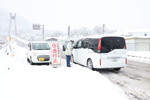 2026.01.23pickup01 記事 X Facebook LINE コピー 2026.01.26 通行止めや休校、バス運休…大雪警報で各方面に影響 大型車両通行止めの対応が取られた国道173号・新綾部大橋交差点(22日午前、味方町で) ※詳細は紙面で。