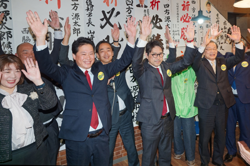 2026.01.26pickup01 記事 X Facebook LINE コピー 2026.01.26 2026.1.25市長選 市議補選四方氏 大差で初当選得票率は69%余に投票率 過去最低の42・76% (前列右から)山崎市長、原田後援会長らと当選を喜び「万歳」する四方氏=駅前通で