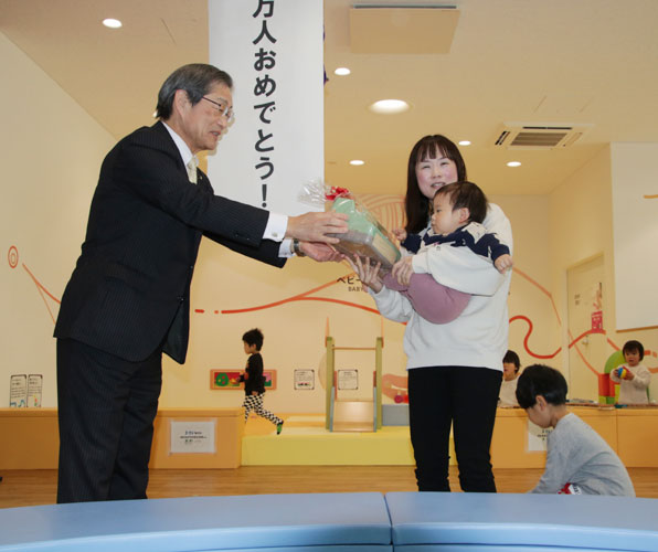 2026.01.28pickup02 記事 X Facebook LINE コピー 2026.01.28 あやっこひろば来館者10万人達成大島町の山﨑さん親子に記念品オープンから2年2カ月市外からの利用は過半数 山崎市長(左)から記念品を受け取る山﨑さん親子=青野町で ※詳細は紙面で。