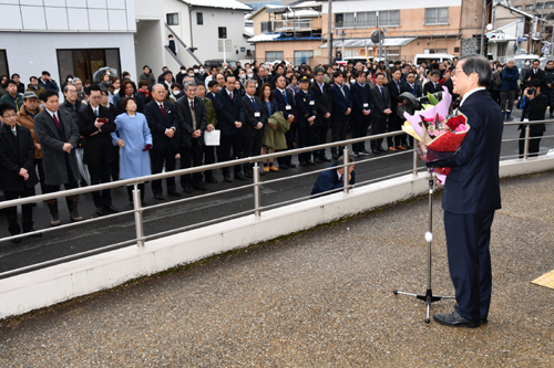 2026.02.02pickup02 記事 X Facebook LINE コピー 2026.02.02 山崎市長 市民ら300人集い退任式「古里に貢献でき幸せ」新市長の下でチャレンジを 退任式に集まった市民らの前であいさつする山崎市長(市役所玄関前広場で) ※詳細は紙面で。