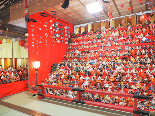 2026.02.13pickup01 記事 X Facebook LINE コピー 2026.02.13 3月4日まで東光院で「ひな祭り」展示10周年で「昭和レトロ展」も温泉・集蔵と併せスタンプラリー 東光院の特大ひな段は圧巻の迫力(上延町で) ※詳細は紙面で。