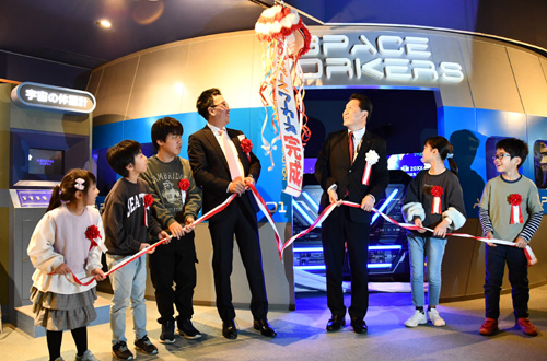 2026.03.04pickup01 記事 X Facebook LINE コピー 2026.03.04 パオに新展示機器完成スペースワーカーズ宇宙空間で三つの任務を体験新キャラクター「パオット」登場 テープカットで完成を喜ぶ四方市長(右から3人目)と招待された児童ら=写真はいずれも里町で ※詳細は紙面で。