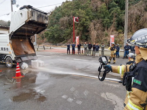 2026.03.06pickup01 記事 X Facebook LINE コピー 2026.03.06 リチウムイオン電池などの充電池安全な利用と分別を!4月から市が収集開始毎月の「資源物・有害ごみ」の収集日に充電池による収集車火災想定市消防本部 初の合同訓練 収集車の乗員らが見守る中、熱画像カメラ(右)も用いつつ消火活動を実演する消防職員たち=味方町で ※詳細は紙面で。