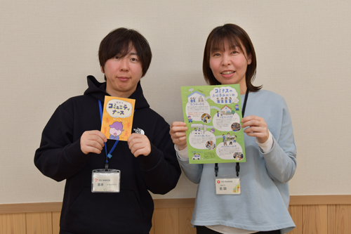 2026.03.23pickup02 記事 X Facebook LINE コピー 2026.03.23 コミナス活動をPR2年ぶり リーフレットを刷新 リニューアルしたチラシとリーフレットを手にする岩田さん(右)と重本さん=物部町で ※詳細は紙面で。