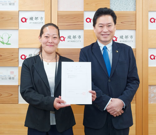 2026.04.01pickup01 記事 X Facebook LINE コピー 2026.04.01 由良川下り事業 担い手決まる東京都出身の片岡真奈美さん(41)山家地区の乗艇場活用に向け市が地域おこし協力隊に任命山家の渓流に「心奪われた」 四方市長(右)から任命書を受け取った片岡さん=市役所市長応接室で ※詳細は紙面で。