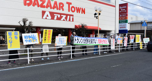 2026.04.08pickup02 記事 X Facebook LINE コピー 2026.04.08 市民らが反戦活動日本も〝対岸の火事〟でないアスパ前で声上げ訴え 横断幕やプラカードを持って反戦を訴える市民ら(綾中町で) ※詳細は紙面で。