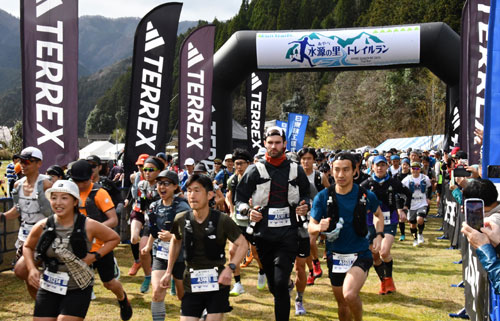 2026.04.08pickup01 記事 X Facebook LINE コピー 2026.04.08 本社後援第4回「水源の里トレイルラン」過去最多994人がエントリー完走は2コースで824人海外からも43人 スタートする50㌔コースのランナーたち(睦寄町で) ※詳細は紙面で。