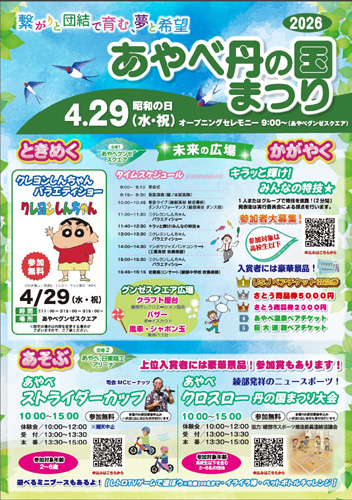 2026.04.13pickup02 記事 X Facebook LINE コピー 2026.04.13 29日のあやべ丹の国まつり青少年の参加募集開始クレヨンしんちゃんショーも「未来」「グルメ」「国際」3会場で特技披露でUSJチケット小中学生向けの仕事体験外国人向けのカラオケ大会企業協賛も広く募集 各種イベントが紹介された丹の国まつりのチラシ ※詳細は紙面で。