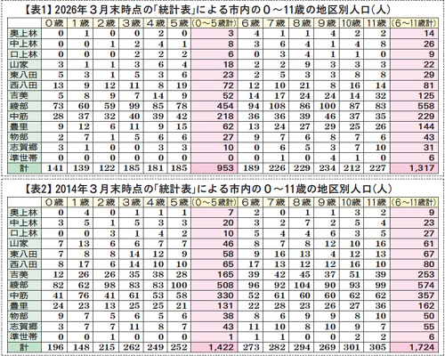 2026.4.17pickup01 記事 X Facebook LINE コピー 2026.04.17 綾部の人口を考える⑨新入生ゼロの可能性 今後も最新の「地区別年齢別人口統計表」から新小学1年生200人未満に市街地と郊外の差も顕著児童数は将来1千人未満か綾部中に集中 【表1】 2026年3月末時点の「統計表」による市内の0~11歳の地区別人口(人)【表2】 2014年3月末時点の「統計表」による市内の0~11歳の地区別人口(人) ※詳細は紙面で。
