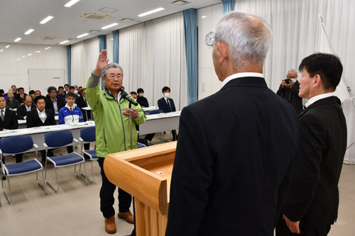 2026.04.20pickup01 記事 X Facebook LINE コピー 2026.04.20 役員と選手が活躍誓う四都市大会の結団式市民総合スポーツ大会の開会式も主に福知山市で5月10日に開催 市民総合スポーツ大会の開会式で選手宣誓をする立藤さん(西町3丁目で) ※詳細は紙面で。