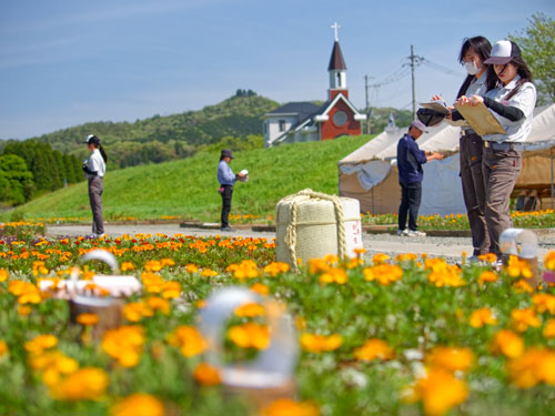 2026.04.24pickup01 記事 X Facebook LINE コピー 2026.04.24 「由良川花壇展」開幕 26日まで「市長賞」はエフエムあやべの花壇表彰式は26日午前9時から 色とりどりの花壇を審査する綾部高由良川キャンパスの生徒と教員たち(青野町で) ※詳細は紙面で。