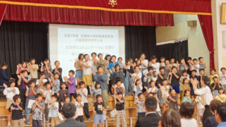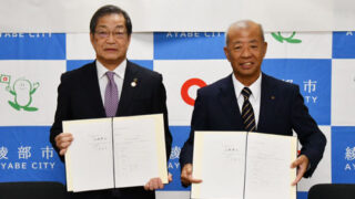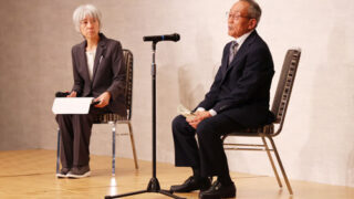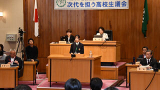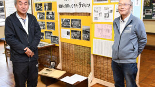 「戦争はあかん、命は尊い」戦後80年の地球市民の集い市遺族会の廣瀬会長が体験講話「語り部事業」始動をアピール綾高放送部の2人が朗読も映画の上映や入賞作品展示壇上で戦争体験について語る廣瀬さん(右)と聞き手の福井さん=青野町で※詳細は紙面で。